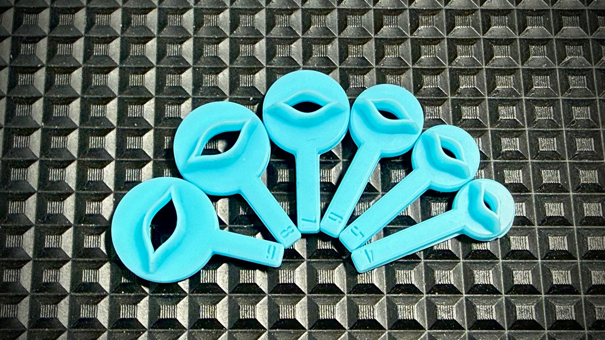 6x finely crafted, affordable cutters with size ident on a handy handle with a fine cutting edge.